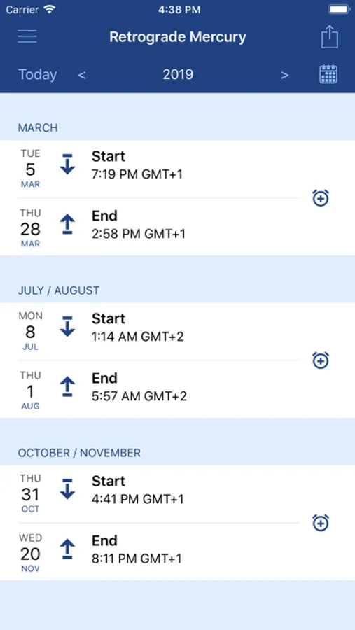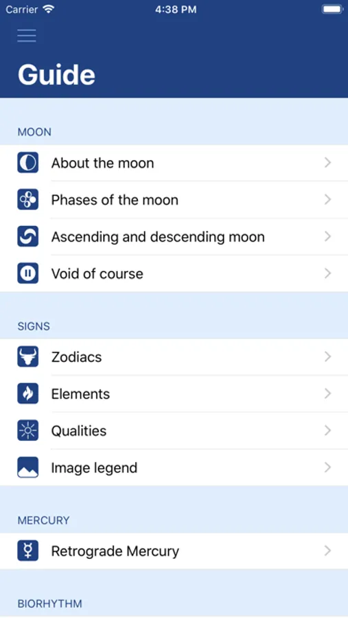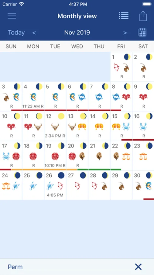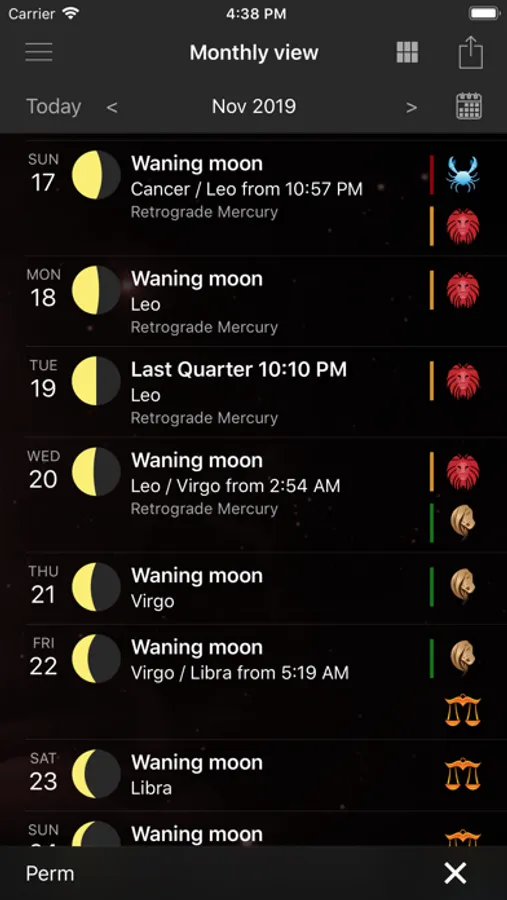 • Monthly view of the moon phases, zodiac signs and retrograde mercury