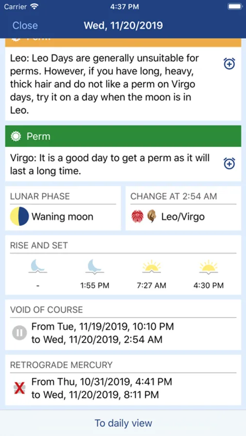 Lunar calendar with void of course, moon/sunrise/sunset, retrograde mercury and biorhythm!