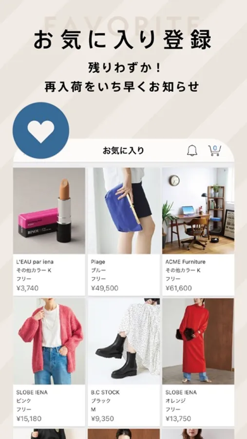 お気に入り機能といっしょに使うことで、「お気に入りアイテムの値下がり、再入荷」や「お気に入りブランドの新着情報」をプッシュ通知にてお知らせします。