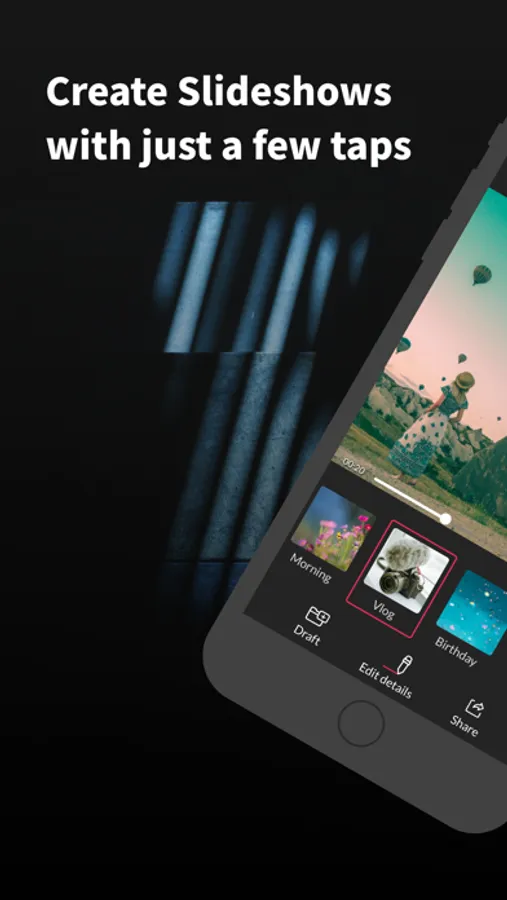 The app is very fun and easy to make slideshow videos. Starting by selecting photos and/or videos you want, then the application will automatically create a slideshow for you. After that, you can export or edit the slideshow using below tools: