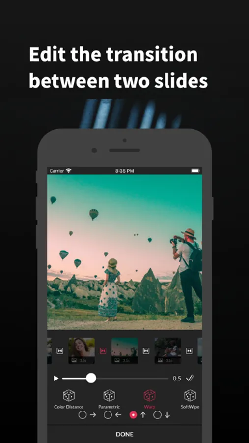 - Tap on a transition icon which is in the middle of two slides to change transition types.