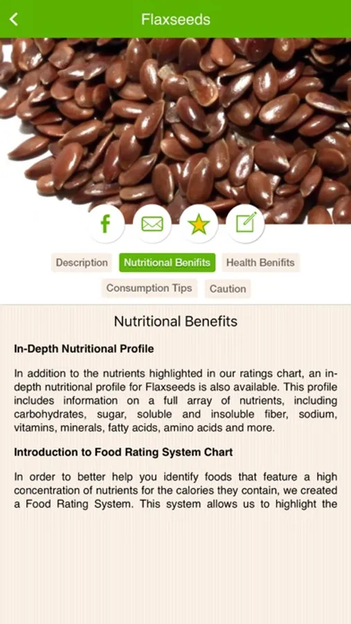 • Detailed information for each food like Nutritional Benefits, Health benefits, Consumption Tips, Caution tips etc.