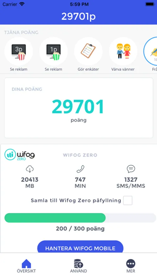 Wifog är ett supersmart sätt att få ersättning för saker du ändå gör. Du tjänar poäng genom att titta på reklamfilm, delta i undersökningar samt värva vänner. Poängen använder du sedan för att få gratis eller superbillig mobiltelefoni.