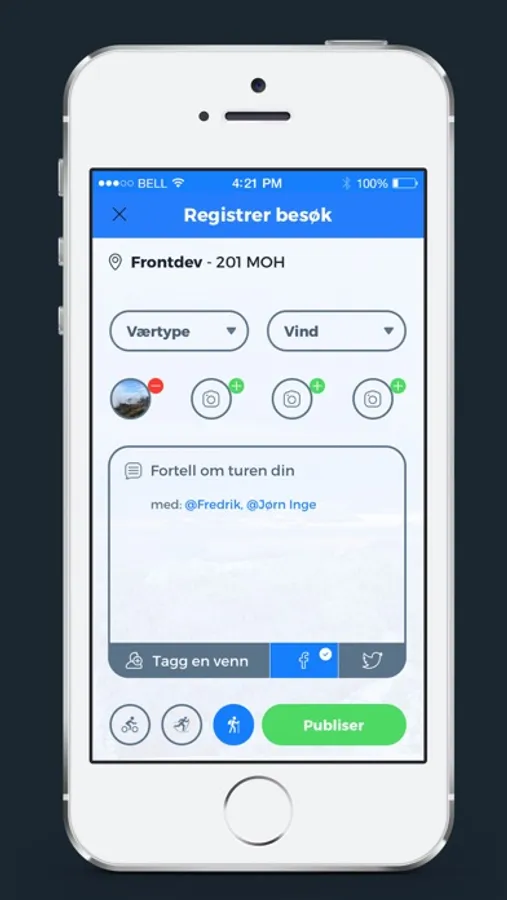 Digital fjellbok for registrering og deling av dine naturopplevelser. Her kan du laste opp bilder og beskrivelse av opplevelsen som vil være synlig på tidslinjen. Samtidig kan du registrere vær, vind, tagge venner som er med deg på turen, merke av om det er fottur, sykkeltur eller skitur, og dele direkte på sosiale medier.