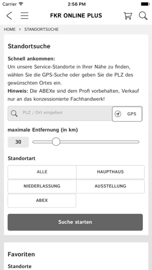 Service für unterwegs: Wo ist der nächste Standort von FKR? Via GPS oder durch die Eingabe der PLZ findet diese App-Funktion die Standorte der FKR-Häuser bundesweit.