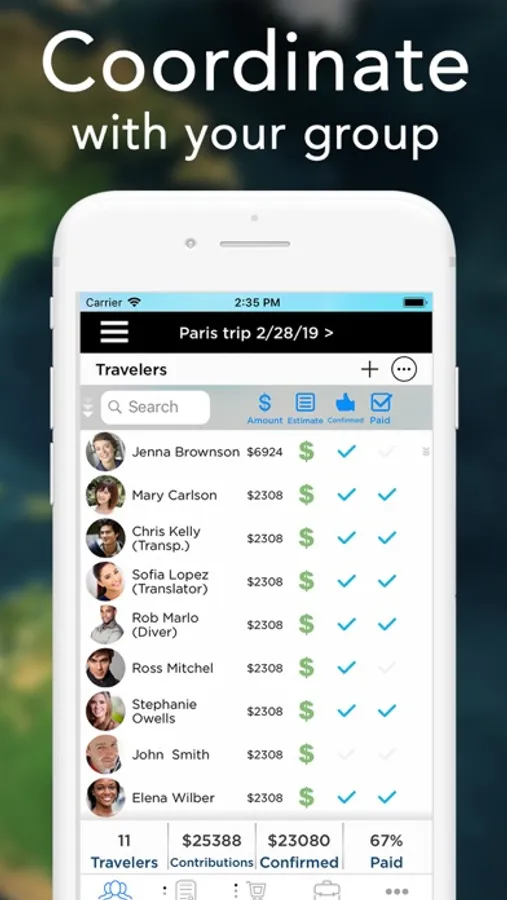 Invite you Travelers to Pro Travel Planner and see their statuses in real time. Travelers contributions can be set manually or on auto (evenly split) or based of the actual expenses detailed in the budget section. It's a really simple and easy way to avoid the awkward discussion about who owes what at the end of your trip...