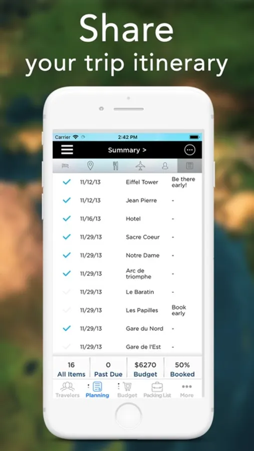 With Pro Travel Planner you can synch with your travel group, organize your packing list, plan your trip, timeline and control your budget all in one App!