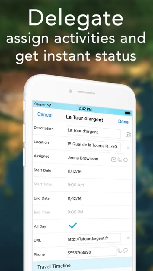 Easily manage your Lodging, Points of Interest, Restaurants, Transportation and even track your local contacts all in one place. You can also visualize all this information on a Timeline.