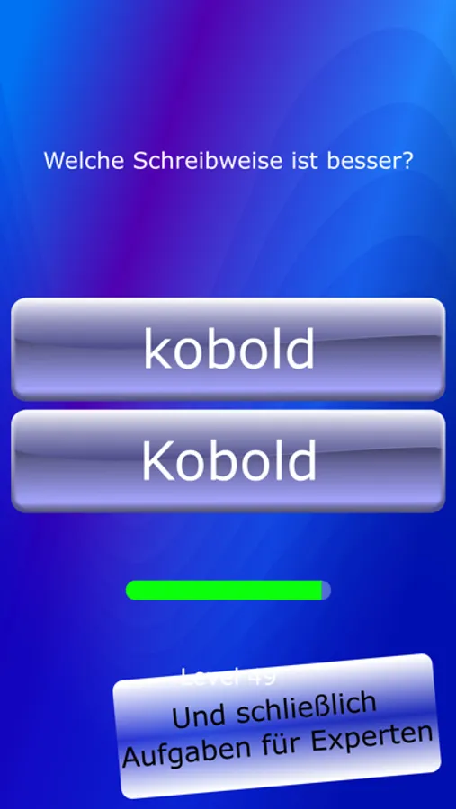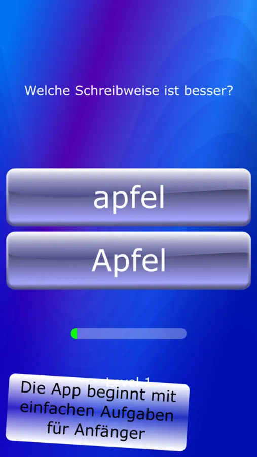 Dieser kleine Trainer wendet sich an die Anfänger, die schon ein bisschen Deutsch lesen können, beim Schreiben und besonders bei der Groß- und Kleinschreibung aber noch nicht sicher sind. Er hilft ihnen zu entdecken und zu üben, welche Wörter groß- und welche kleingeschrieben werden. Das Programm enthält knapp 3200 Wörter, bei denen der Lernende sich zwischen Groß- und Kleinschreibung entscheiden muss.