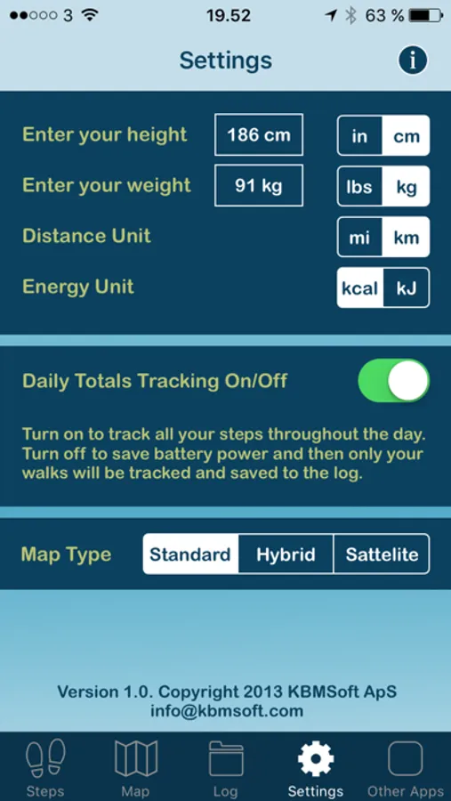 To get started using iSteps, set up your personal profile by entering your height in cm or inches, your weight in lbs or kg, and choose how you want your results displayed, either in kcal or kJ and distance in miles or km. Then press the START button and you are ready to GO!