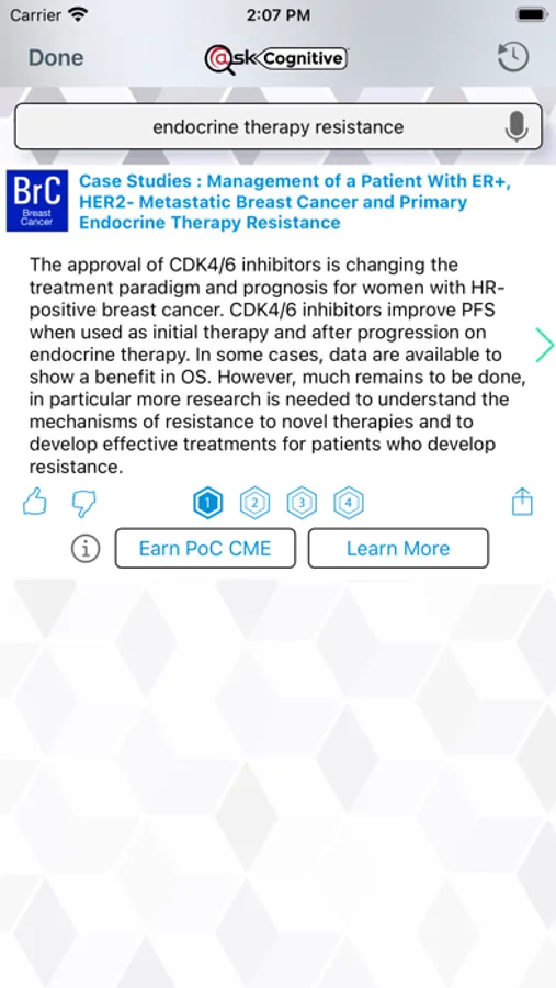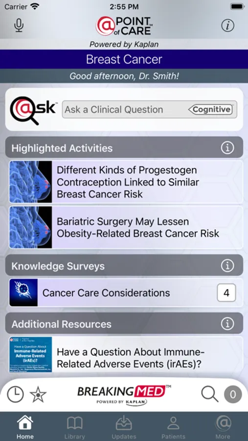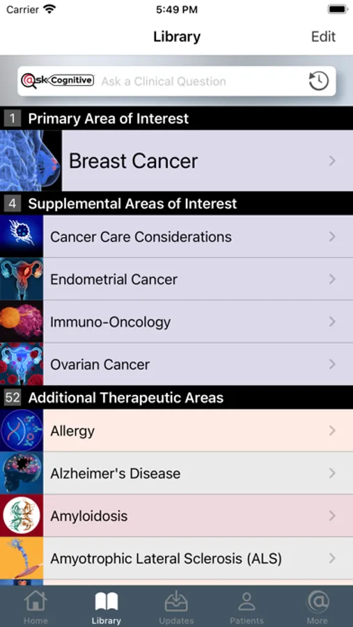 The app features Ask Cognitive™, an AI-assisted search technology to easily access curated, evidence-based, and disease-specific medical content. Clinicians can navigate content by asking voice-enabled natural language questions or typing them in. The Ask Cognitive confidence-rated answers efficiently incorporate the best current treatment options so decisions can be reached confidently and more rapidly, helping to improve patient outcomes. Answers can also be further investigated for deeper dives.