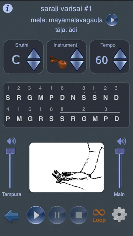 - Sing along and practice saraḷi, jhaṇṭa, dhāṭu varisais, and alaṅkārams, not only in māyāmāḷavagauḷa, but in any of the 72 mēlās, (NEW IN VERSION 2.0) as well as more than 25 pentatonic (auḍava), and 8 hexatonic (śāḍava) ragas. Adjust the sruthi, and tempo according to your comfort level. Select the instrument from veena, guitar, flute, or (NEW IN VERSION 2.0) Violin.