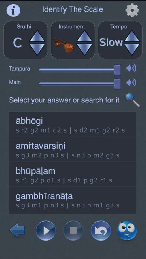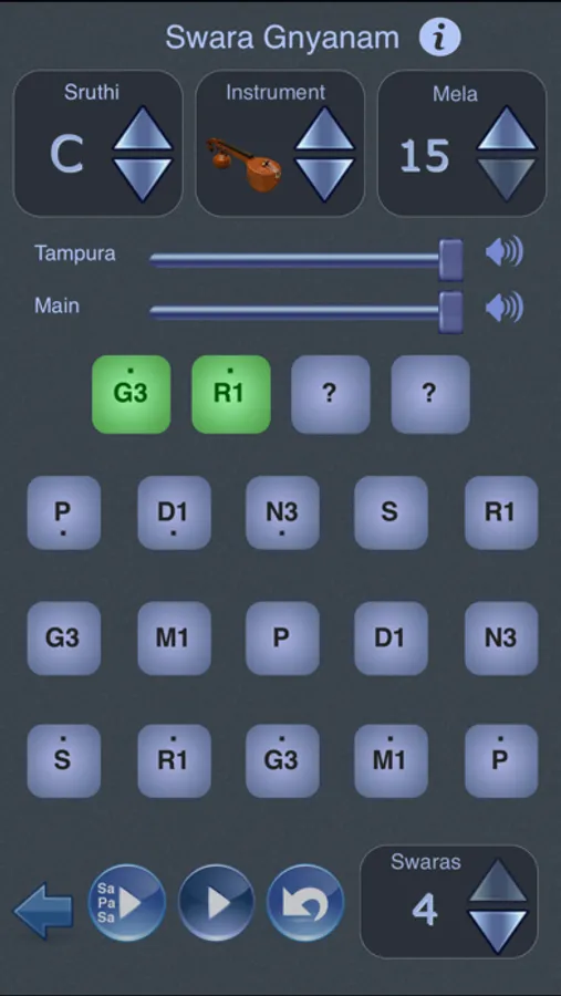 - Get better at identifying swaras using the Swara Gnyanam feature, which is in the form of a game in which the app generates an arbitrary pattern of 1 to 4 swaras, and you have to identify the swaras.