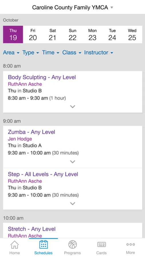 • Easily view schedules for each day and filter for the types of classes that you like.