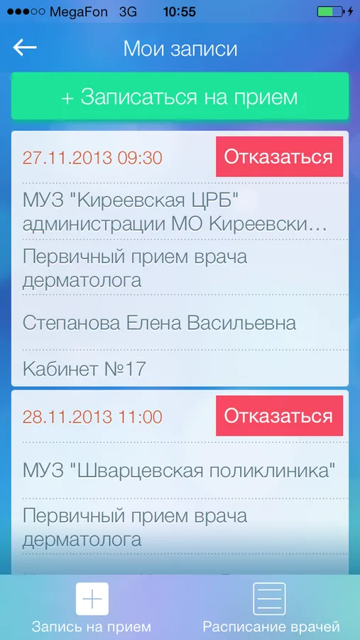 Приложение позволяет исключить необходимость посещения районной поликлиники для записи на прием. Врач-online экономит самое важное – время. Данное приложение позволит записаться на первичный прием к участковому врачу и узкому специалисту вашей поликлиники.