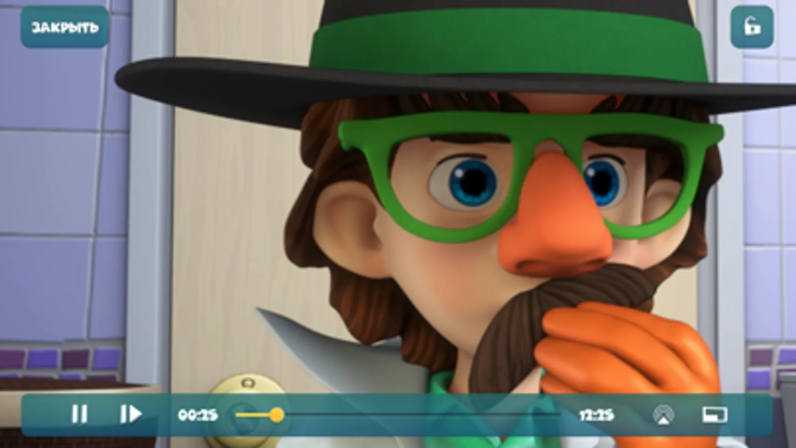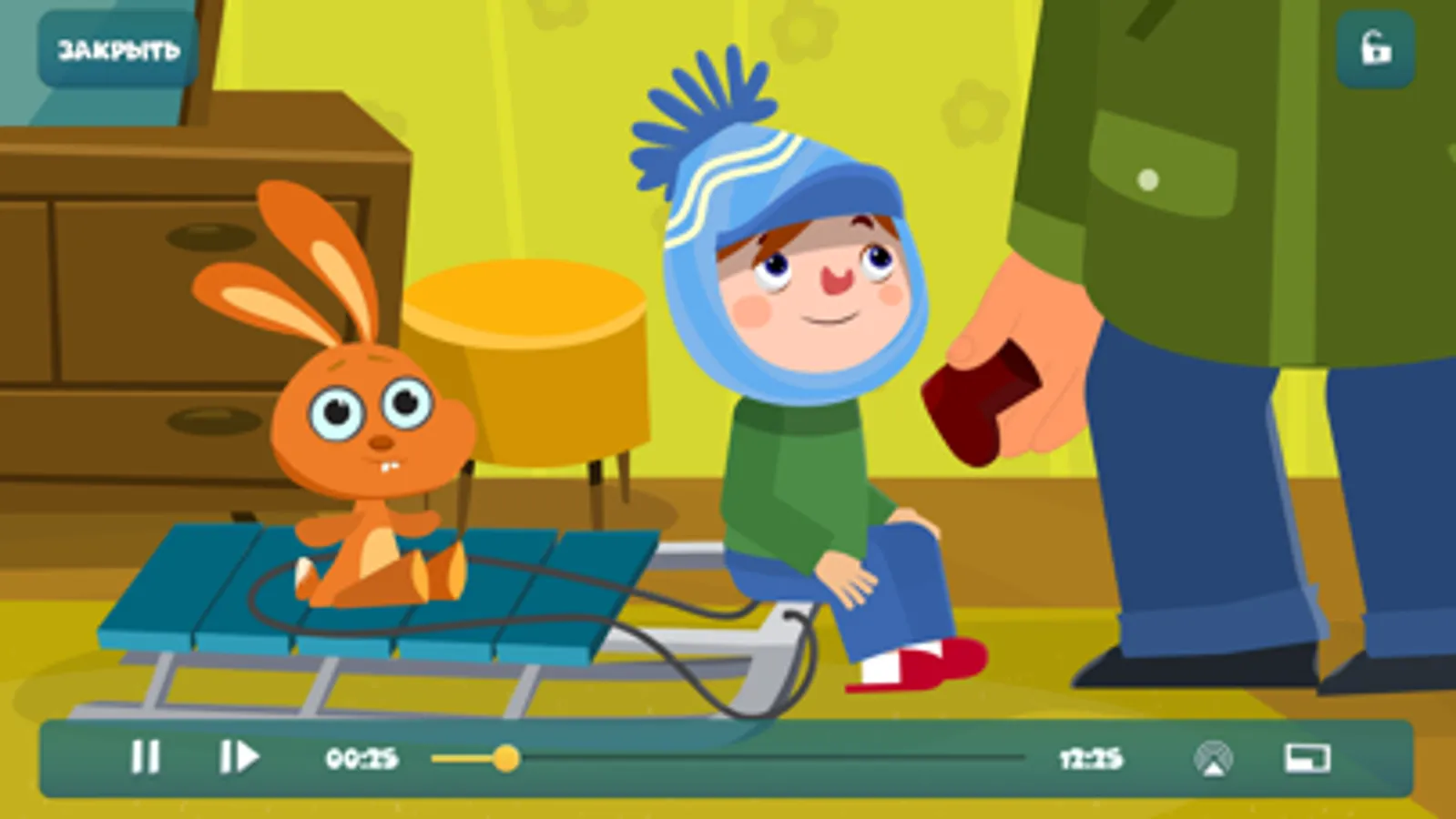 3. "Замок" для детей. Частая проблема приложений по просмотру мультфильмов заключается в том, что ребенок может трогать персонажей во время просмотра видео. В результате просмотр останавливается, ребенок расстраивается, мама или папа вынуждены отвлекаться от своих дел, чтобы возобновить просмотр. Мы предусмотрели функцию, позволяющую избежать этой проблемы. В режиме просмотра мультфильма дотроньтесь до экрана, затем в верхнем правом углу найдите иконку "замок", нажмите на нее. Теперь весь экран заблокирован и ребенок может сколько угодно трогать его своими пальчиками и просмотр видео не прервется! Чтобы разблокировать экран, еще раз нажмите по замку. Для этого в режиме просмотра видео нажмите в любое место, затем на "замок" в правом верхнем углу.