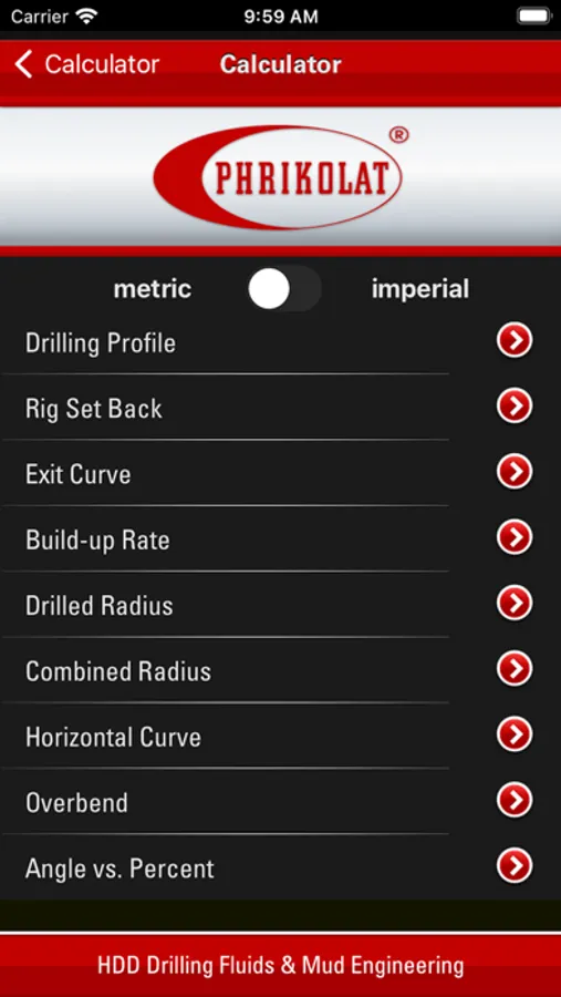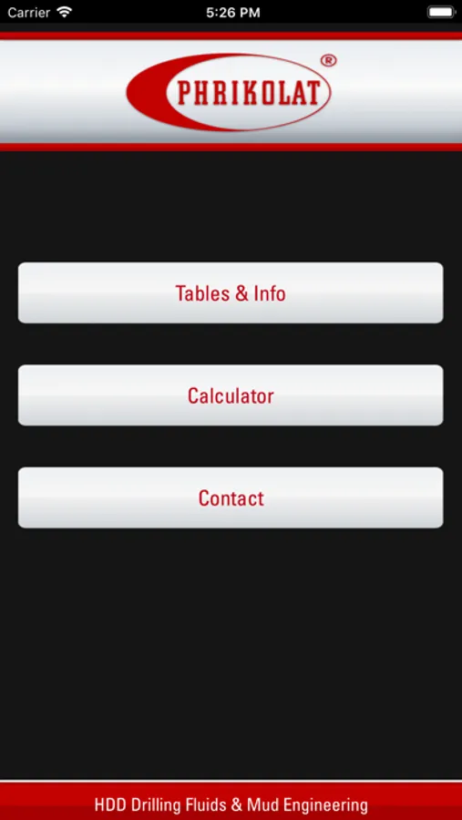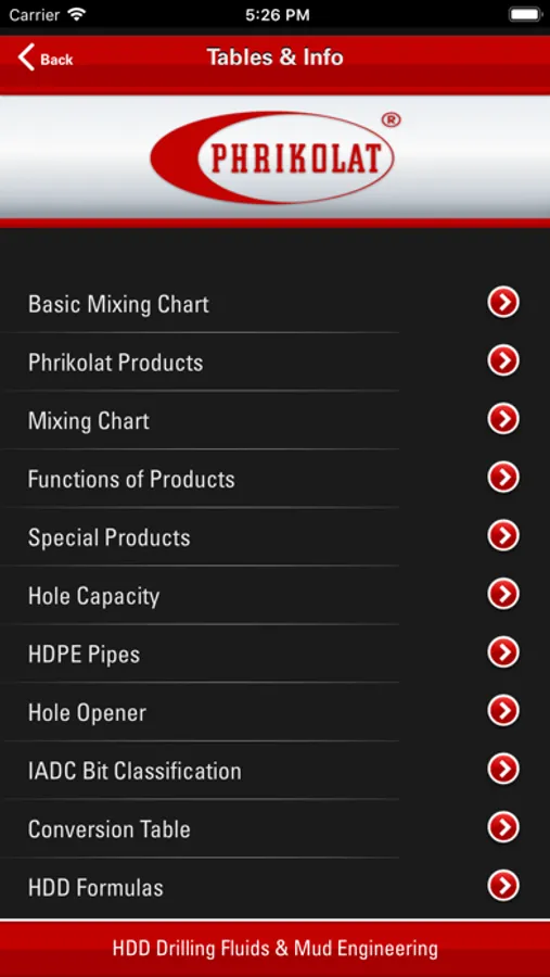 In this App you will find information on the Phrikolat drilling fluid products and their use in different soil conditions (mixing tables) as well as tables with HDD related dimensions and main characteristics of HDPE-Pipes, conversion tables of physical units and much more.