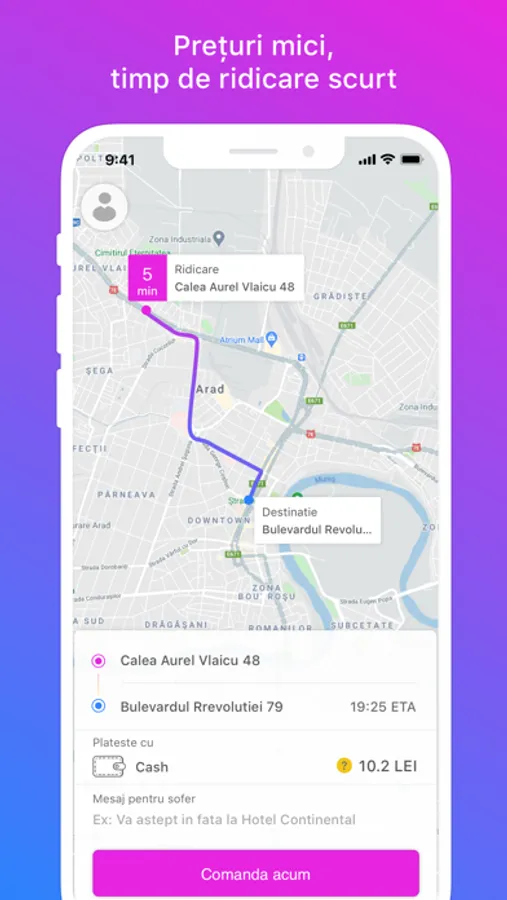 * Ajustezi punctul de ridicare pe harta live, astfel șoferul va sosi exact unde iți este ție mai confortabil.