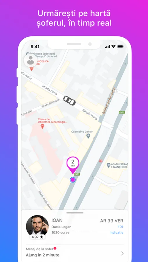 * Primești notificări înainte de sosirea șoferului și pentru că poți urmări deplasarea lui pe harta în timp real, ști exact când ajunge.