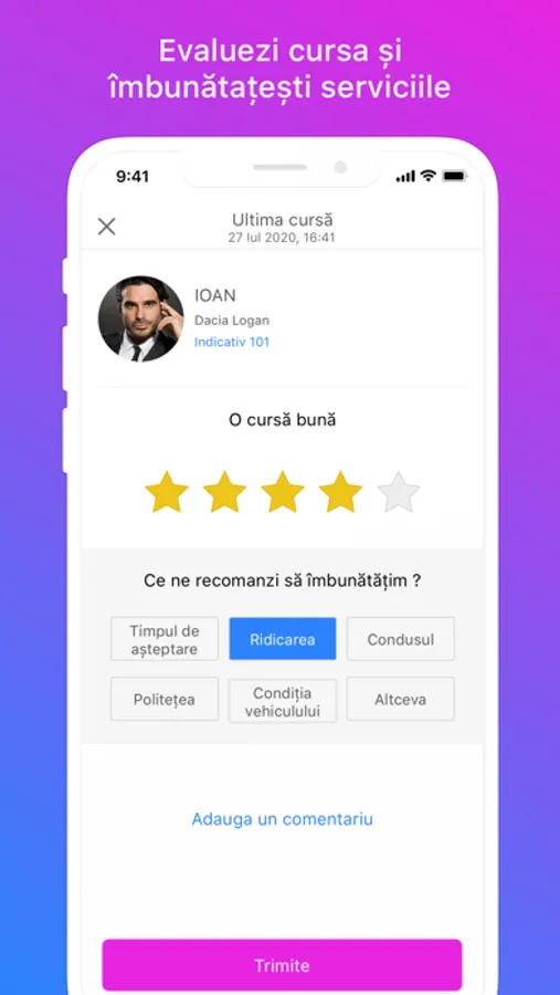 * Evaluezi cursa și trimiți recenzii, astfel îmbunătățești serviciile Taxi Verbita și ajuți alți pasageri sa ia cea mai buna decizie.