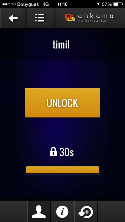 Any time you want to link your account to one of our games (DOFUS, WAKFU or KROSMASTER) or sites, you must first launch the app and press the ‘Unlock’ button. This simple action authorises you to log on for a period of 30 seconds. After this period is over, nobody can access your account.