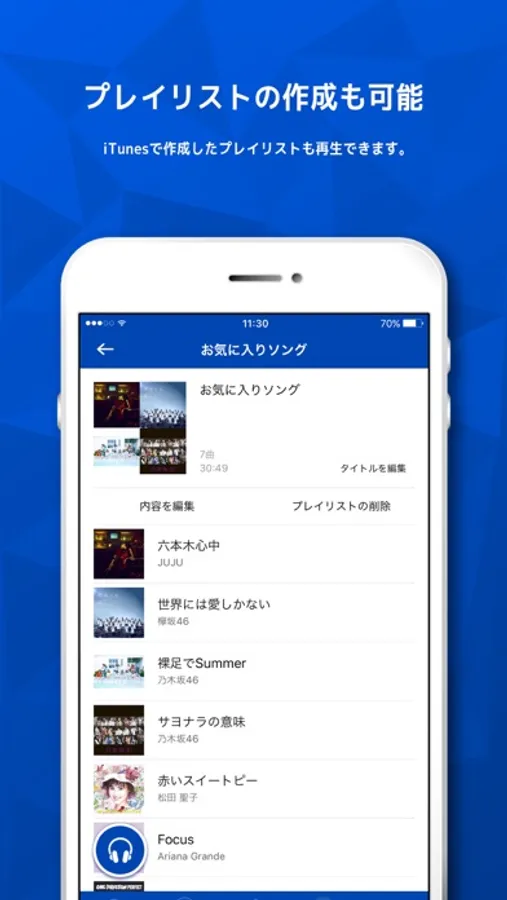 ・プレイリストの作成も可能。ダウンロードした曲と端末内の曲(iTunesで同期した曲)をミックスして、オリジナルのプレイリストが作成できます。