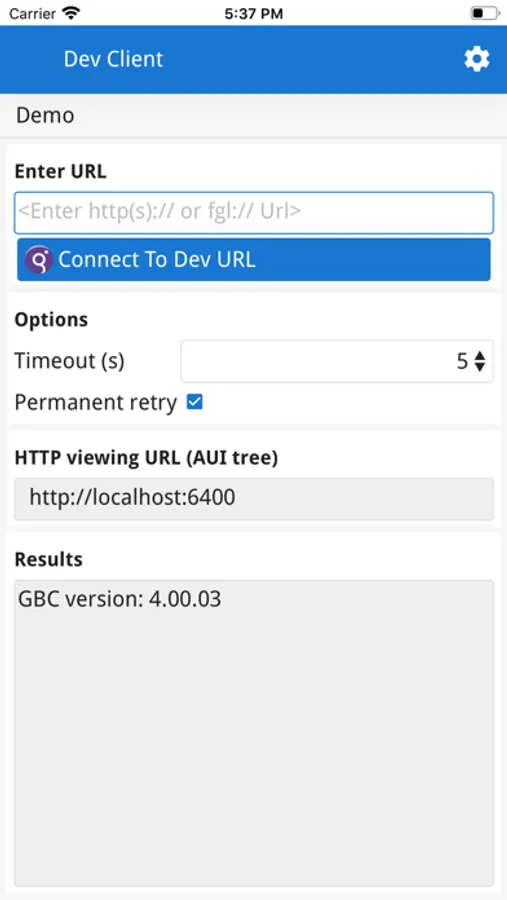 · One has to enter a valid application URL in the "Connect to Dev server" dialog. The app connects then via http(s) to a Genero Application Server (GAS) in order to get a preview of the remote application under development.