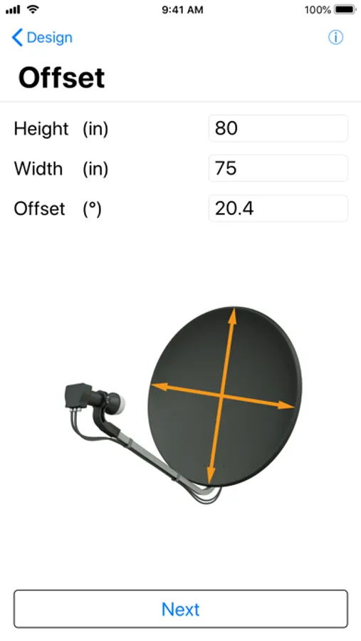 If you decide on the oval offset dish, you just need to input the offset angle or the length and width of the dish. Now the app has all the data to adjust your sat system correctly. All the necessary angles can now be calculated automatically.