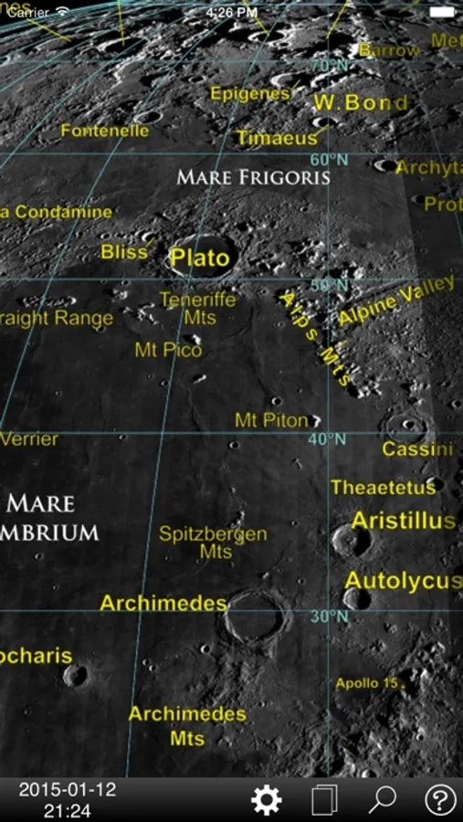 * On initial screen, only names of seas are shown; as zoom begins, crater names appear.