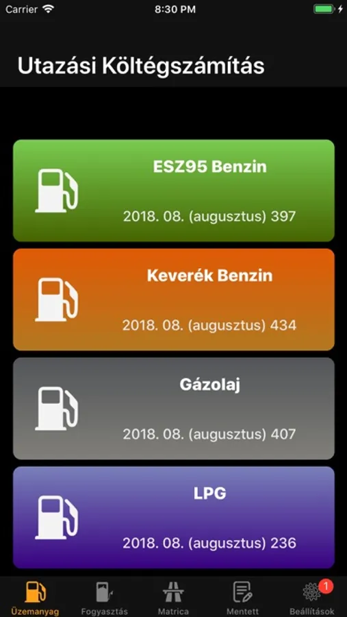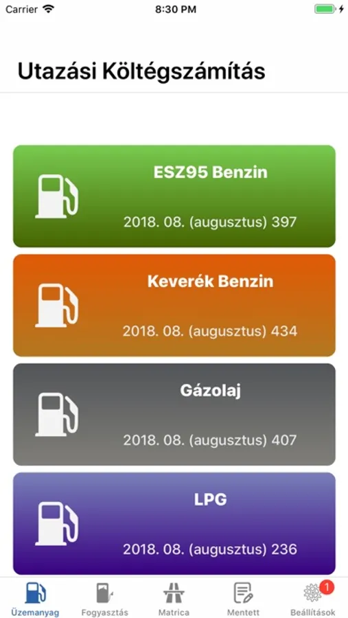 A mentett adatoknál jelennek meg a mentett fogyasztási és Utazási költségszámítási adatok. Az utazási költségszámítási adatok érintésekor részletesen megtekinthetőek a rögzített adatok.