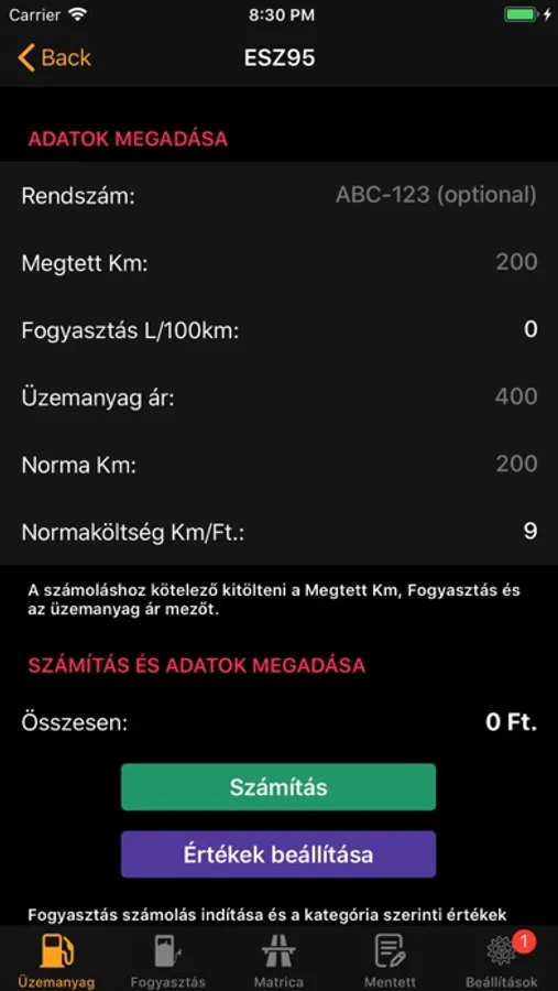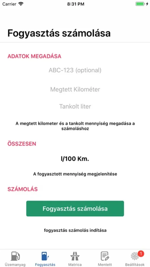 A számoláshoz meg kell adni a megtett kilómétert és a tankolt liter mennyiséget a fogyasztás számolás gomb érintésekor megjelenik a gépjármű fogyasztása L/100km egységben a kiszámolt értékek mentésre kerülnek a mentett nézethez. A rendszám mező kitöltése ajánlott ha üresen hagyjuk akkor az ABC-123 név-el mentődik az adat.