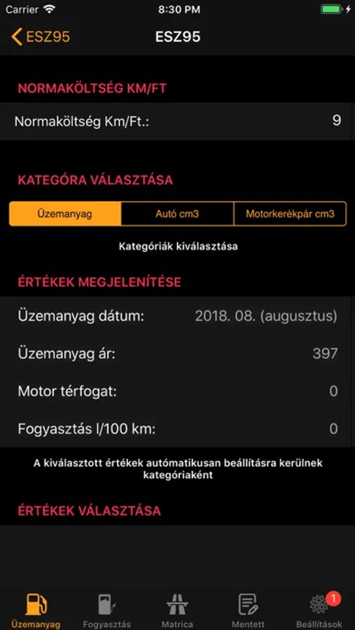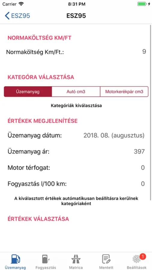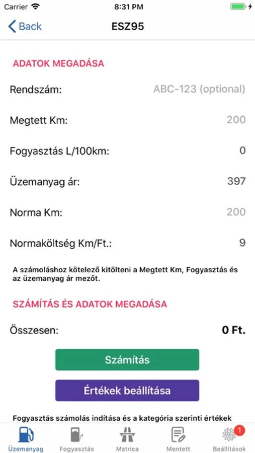 • Az értékek beállításánál csak be kell állítani a gépjárműhöz megfelelő értékeket és az alapján kell a számítást végezni.