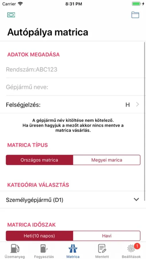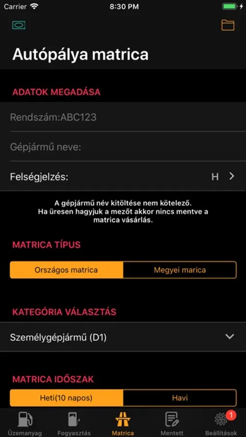 Az e-matrica vásárlásához ki kell tölteni a rendszám mezőt és válasszuk ki a megfelelő kategóriát és időszakot. A vásárlás gomb érintésekor az alkalmazás összeállítja a szöveges üzenetet küldéséhez. A szöveges üzenet sikeres küldése után a vásárolt matrica automatikusan mentésre kerül és lejárati idő értesítés is beállításra kerül ha a gépjármű neve mezőt is kitöltjük.