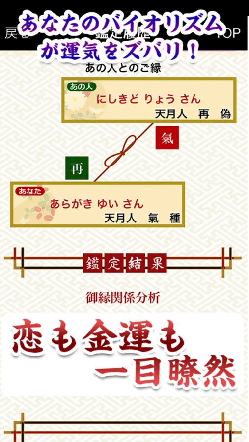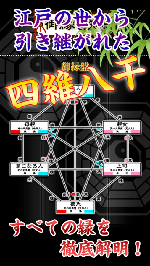 誕生日を基に、六星タイプ、気質を導き出し、運命御縁盤に落とし込むことで、出会い・片想い・復縁・相性・恋愛などの縁結びはもちろん、家族・会社の人間関係、起業、転職、就職、復縁などあらゆる縁を可視化できます。