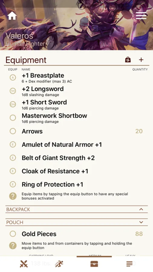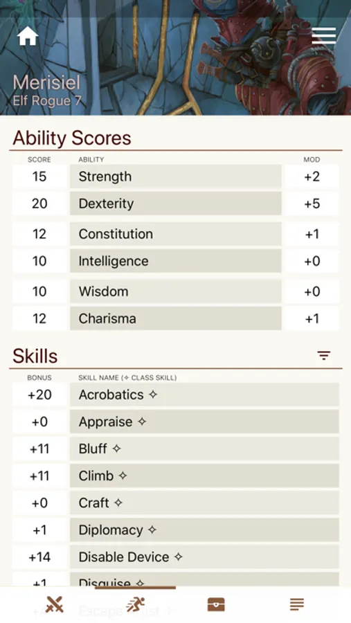 Adventurers! Track your 3.5 and Pathfinder characters this digital character sheet. This app will serve as a replacement for your character sheets. It keeps track of nearly everything you need to play your RPG, and includes a dice roller for quick and easy rolls with all the math done for you.