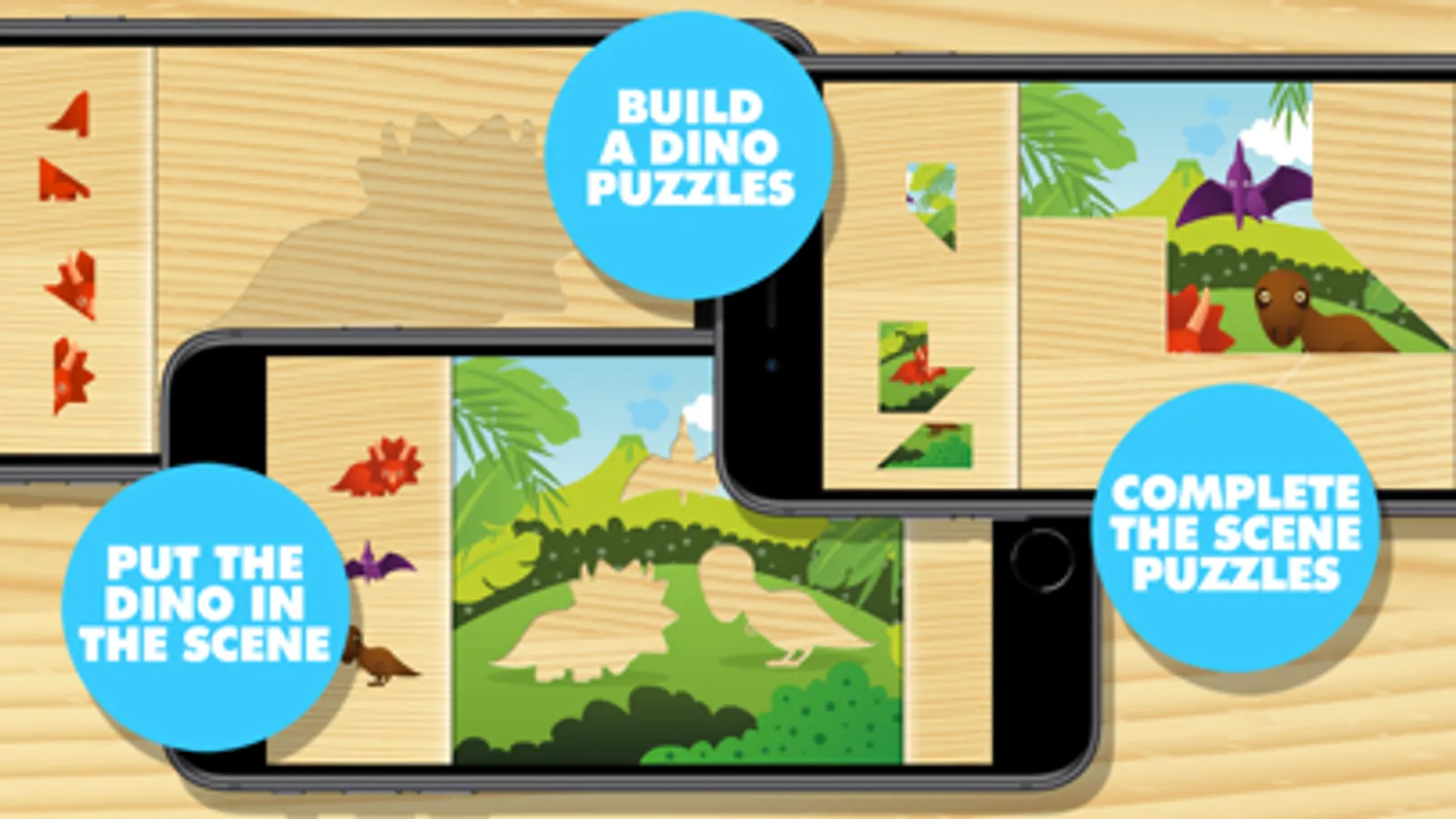 Your child will learn new words and shapes as they drag the pieces of each puzzle around to create a picture or fill in the dinos which inhabit each scene.