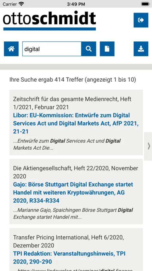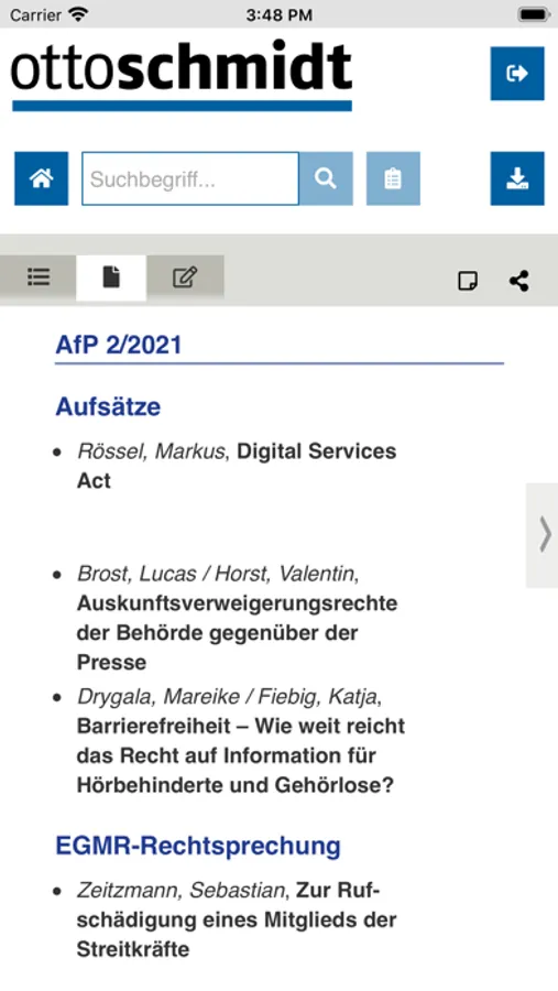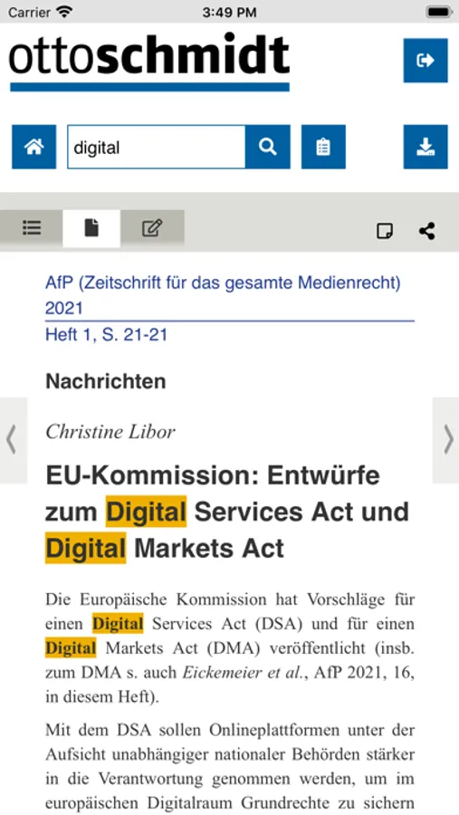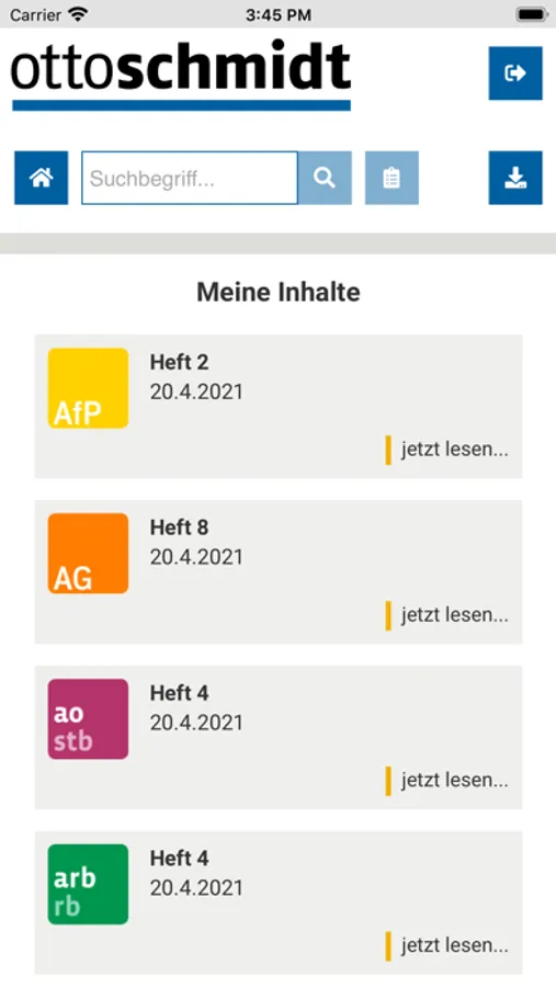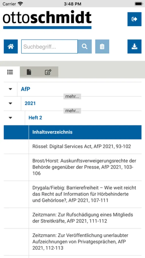 Die Zeitschriften-App des Verlages Dr. Otto Schmidt ermöglicht Abonnentinnen/Abonnenten kostenlos den mobilen Zugriff auf die Inhalte ihrer juristischen und steuerlichen Fachzeitschriften. Verfügbar sind die Hefte des aktuellen Jahrgangs sowie die beiden zurückliegende Jahrgänge. Abonnentinnen/Abonnenten können heruntergeladene Hefte offline lesen, über die Volltextsuche recherchieren und persönliche Lesezeichen und Notizen einfügen.