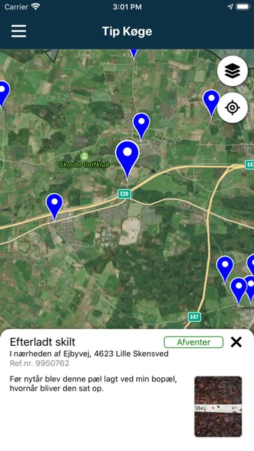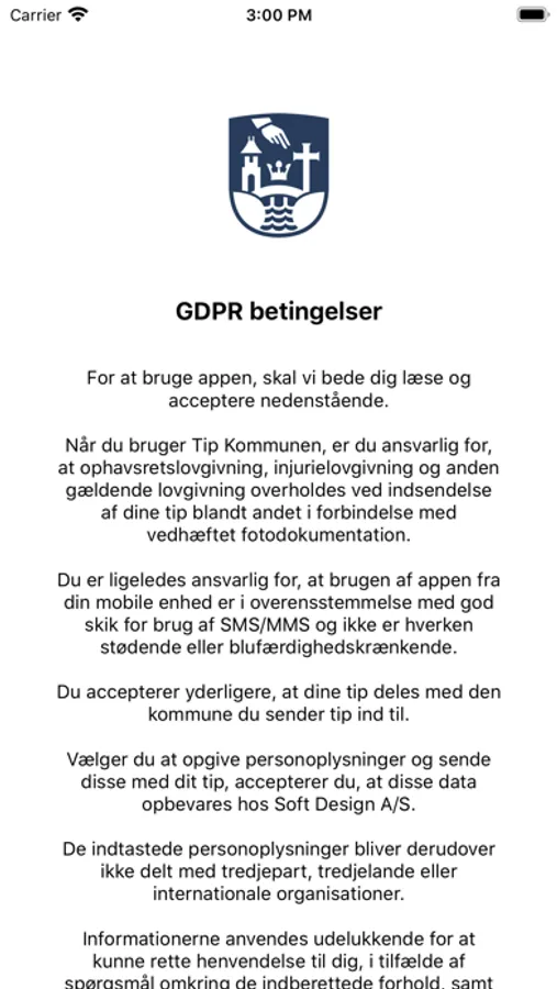 Soft Design A/S er ikke ansvarlig for fejl og mangler ved positionering med GPS koordinater, afsendelse eller modtagelse af meldinger og data. Soft Design A/S kan ikke garantere for forløb efter overdragelse af tip til kommunen. Tips fremsendes kun til kommuner, der har givet tilsagn om modtagelse.
