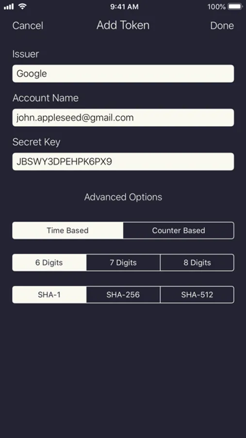 • Compatible: Full support for time-based and counter-based one-time passwords as standardized in RFC 4226 and 6238