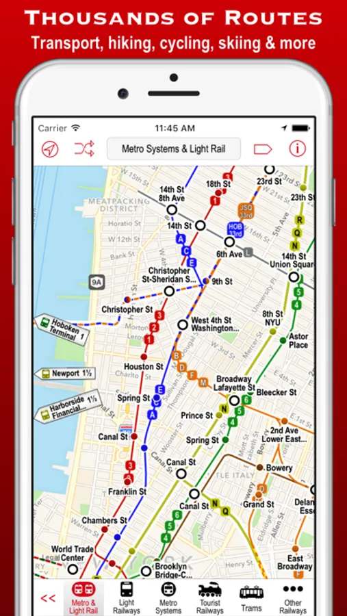 It also contains hundreds of thousands of miles of colour-coded routes, such as railways, subway maps, bus routes, cycle routes, hiking trails and ski pistes. The POIs and routes are all taken from the fantastic OpenStreetMap project.