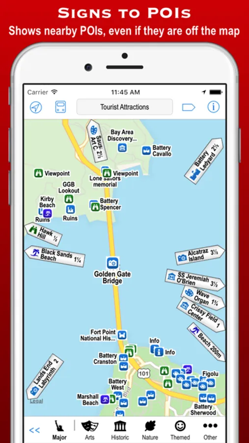 • signs pointing to offscreen POIs, so that you never miss a nearby POI;