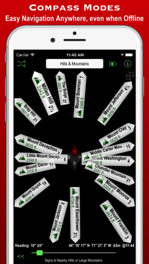 Compass mode simply shows signs to the POIs. This is particularly useful when you just want to know what is around you or which way to head, and you haven’t got time to inspect a map, such as when cycling or hiking. It also works offline and is perfect for people who hate maps: they just follow the sign to where they want to go. It is also great at viewpoints to identify what hills, towns and structures you can see.