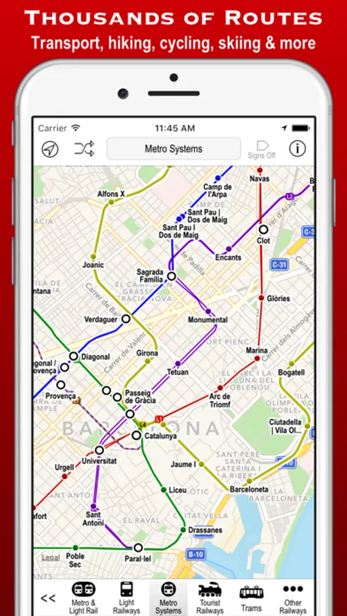 It also contains hundreds of thousands of miles of colour-coded routes, such as railways, subway maps, bus routes, cycle routes, hiking trails and ski pistes. The POIs and routes are all taken from the fantastic OpenStreetMap project.