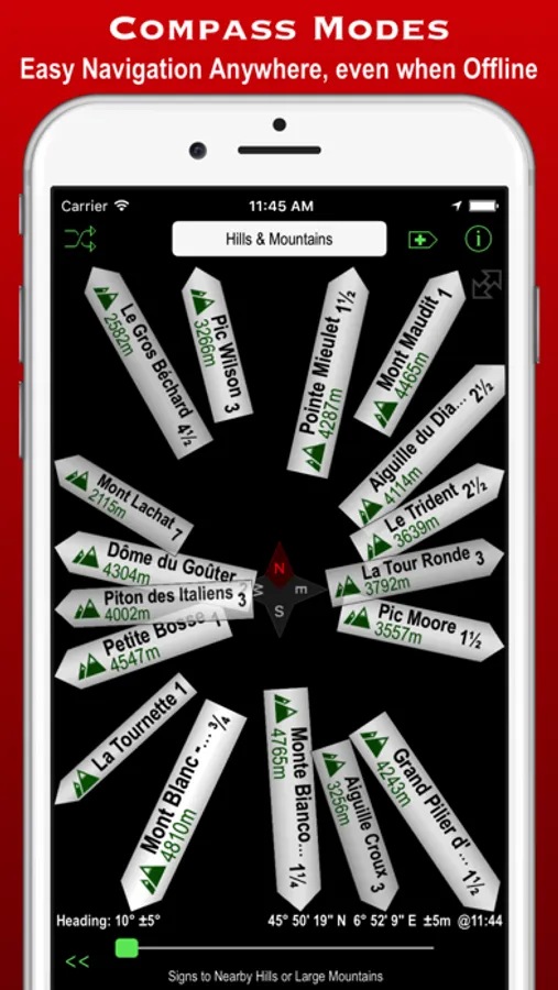 Compass mode simply shows signs to the POIs. This is particularly useful when you just want to know what is around you or which way to head, and you haven’t got time to inspect a map, such as when cycling or hiking. It also works offline and is perfect for people who hate maps: they just follow the sign to where they want to go. It is also great at viewpoints to identify what hills, towns and structures you can see.