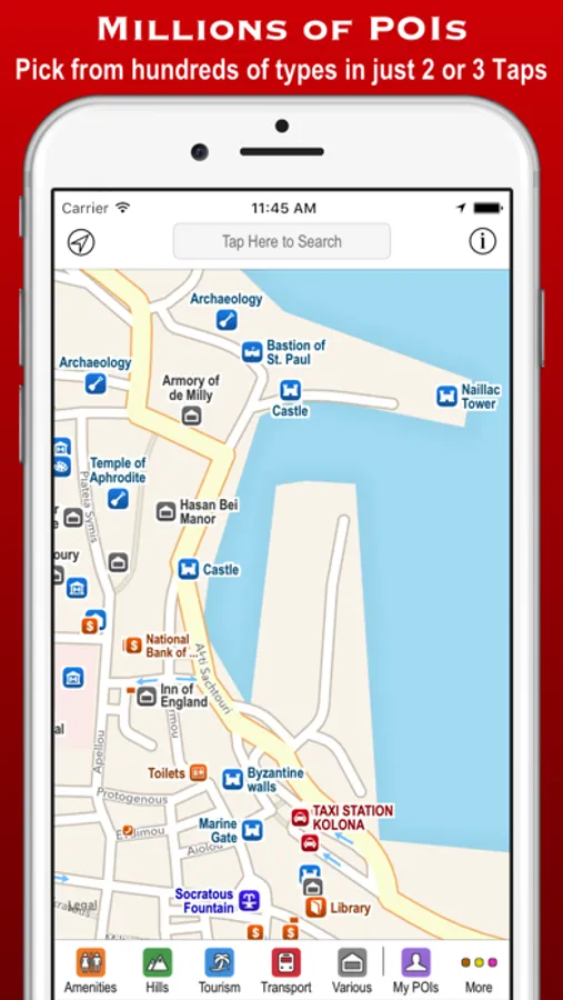 The app contains every possible category of POI: hotels, banks, toilets, tourist attractions, hills, towns, transport, hospitals, churches, schools, libraries, civic buildings, rescue services, fuel stations, restaurants, bars, shops, leisure, parking and much much more.