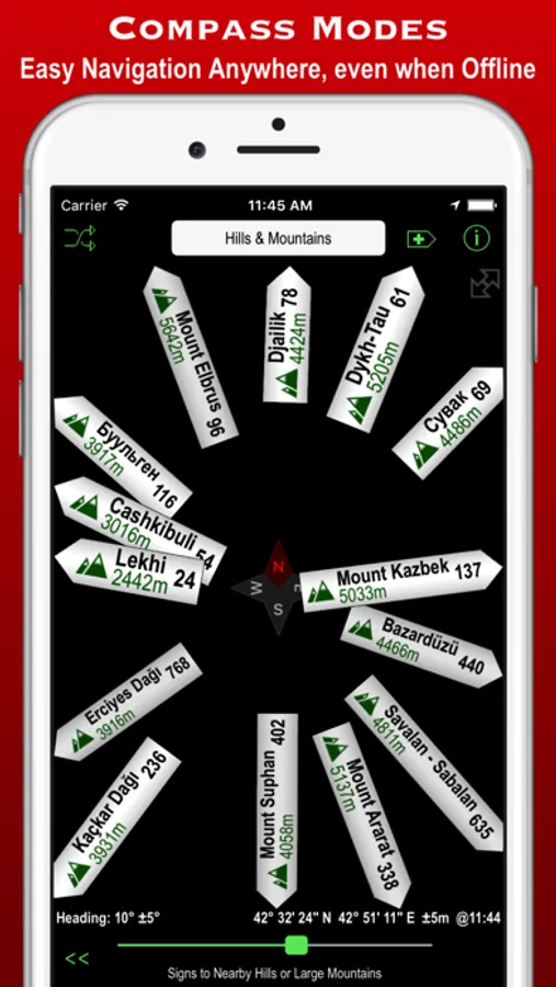 Compass mode simply shows signs to the POIs. This is particularly useful when you just want to know what is around you or which way to head, and you haven’t got time to inspect a map, such as when cycling or hiking. It also works offline and is perfect for people who hate maps: they just follow the sign to where they want to go. It is also great at viewpoints to identify what hills, towns and structures you can see.