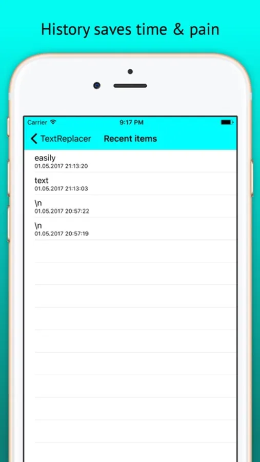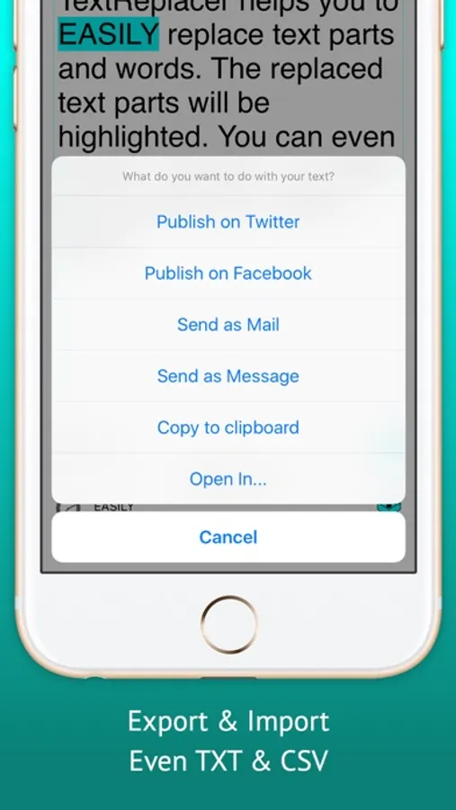 You can also export a file with your result or send it by Mail, Message or just copy it to clipboard. TextReplacer also provides a simple history for faster replacement of reoccurring expressions, Text-to-Speech & custom font size.