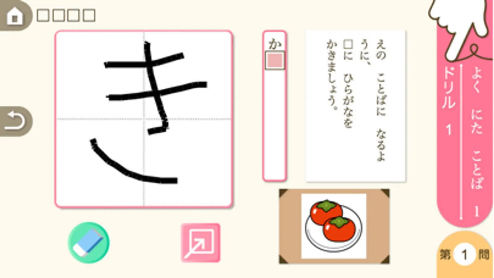=>絵を見て、ひらがな、カタカナの文字を書くドリルです。文字は手書き文字認識機能により自動で採点されます。