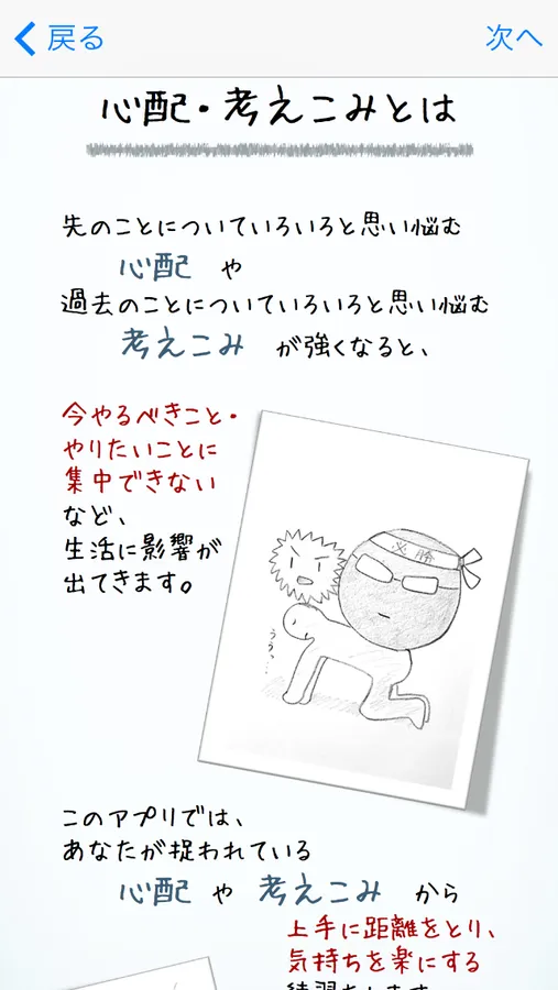 このアプリは,「マインドフルネス」という,心理療法のひとつである認知行動療法の新しい考え方に基づいています。心配や考えこみをしてネガティブになってしまう状態を無理やりに変えようとするのではなく,「今・ここ」で自分が何をしたいのか,何をすべきかということに目を向ける大切さを説明します。