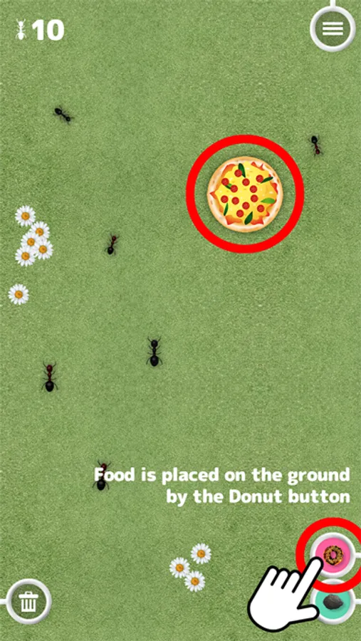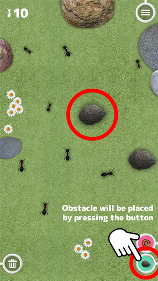 Use the donut button to put down food and the rock button to put down obstacle rocks.